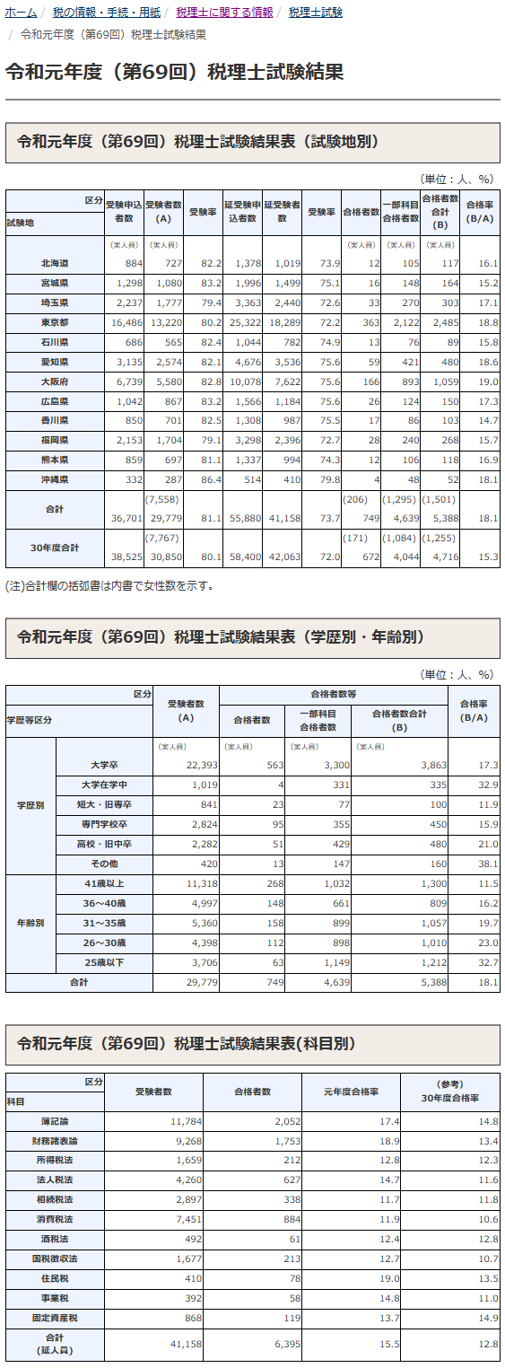 令和元年度(2019年)第69回 税理士試験 試験結果