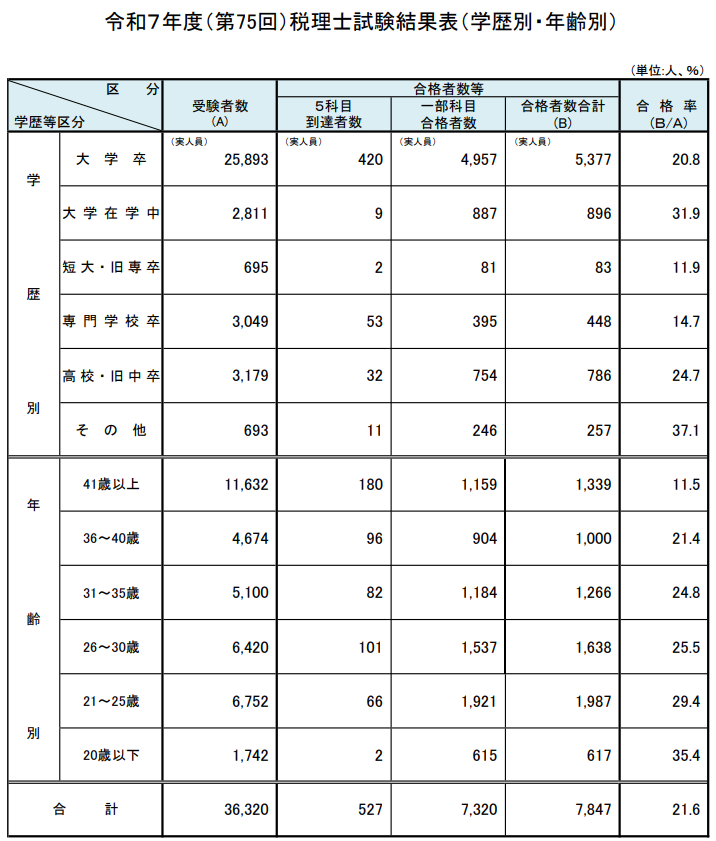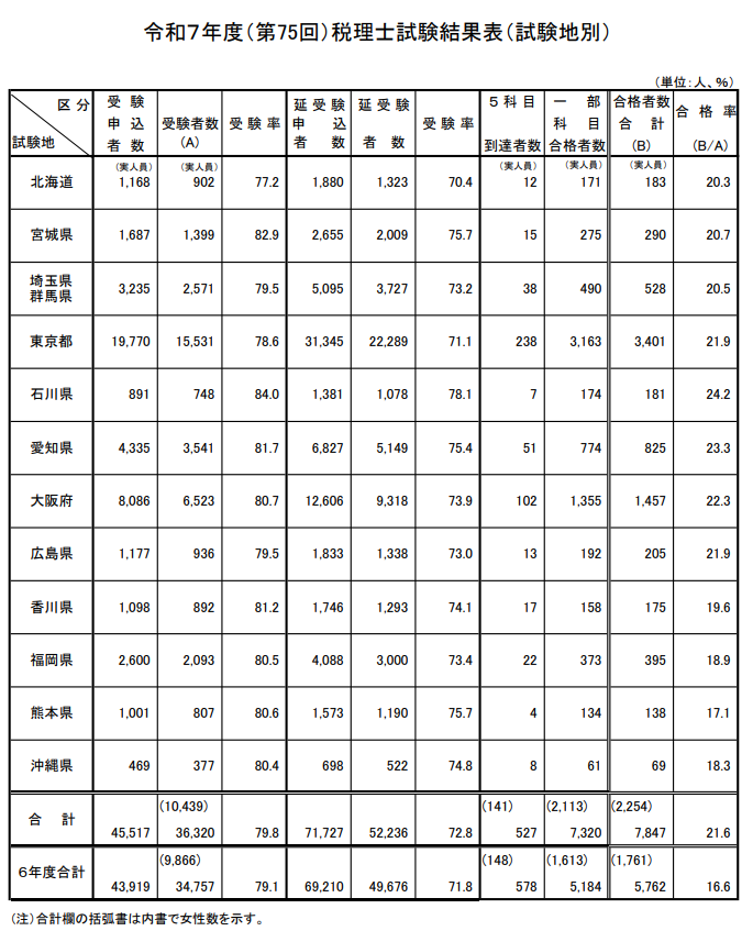 令和7年度(2025年)に実施された第75回税理士試験の試験結果データです。受験者数・合格者数・合格率を地域別・年齢別・学歴別・科目別に掲載しています。